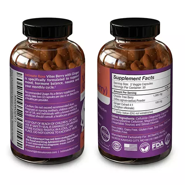El Vitex con Jengibre de Intimate Rose combina el poder regulador del sauzgatillo (Chaste Tree Berry) con las propiedades antiinflamatorias y digestivas del extracto de jengibre (100 mg), creando una fórmula única para apoyar el equilibrio hormonal femenino y aliviar los síntomas del ciclo de forma natural.
